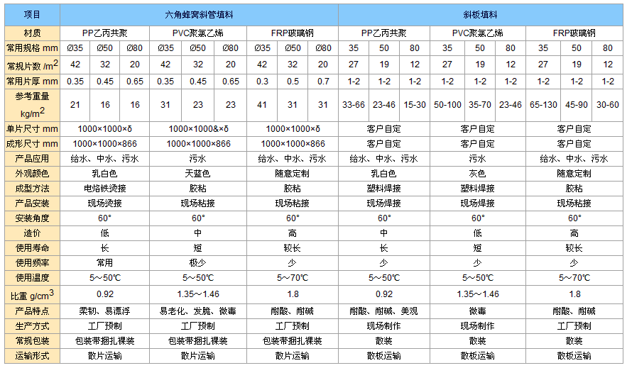 填料組裝形式有斜管、直管兩種,材質(zhì)有聚丙烯、乙丙共聚、聚氯乙烯三種,主要優(yōu)點有:韌性強、組裝強度好不變形、不脆裂、使用壽命長、抗老化期在原聚丙烯填料3-5年的基礎(chǔ)上可延長5-8年的使用壽命。